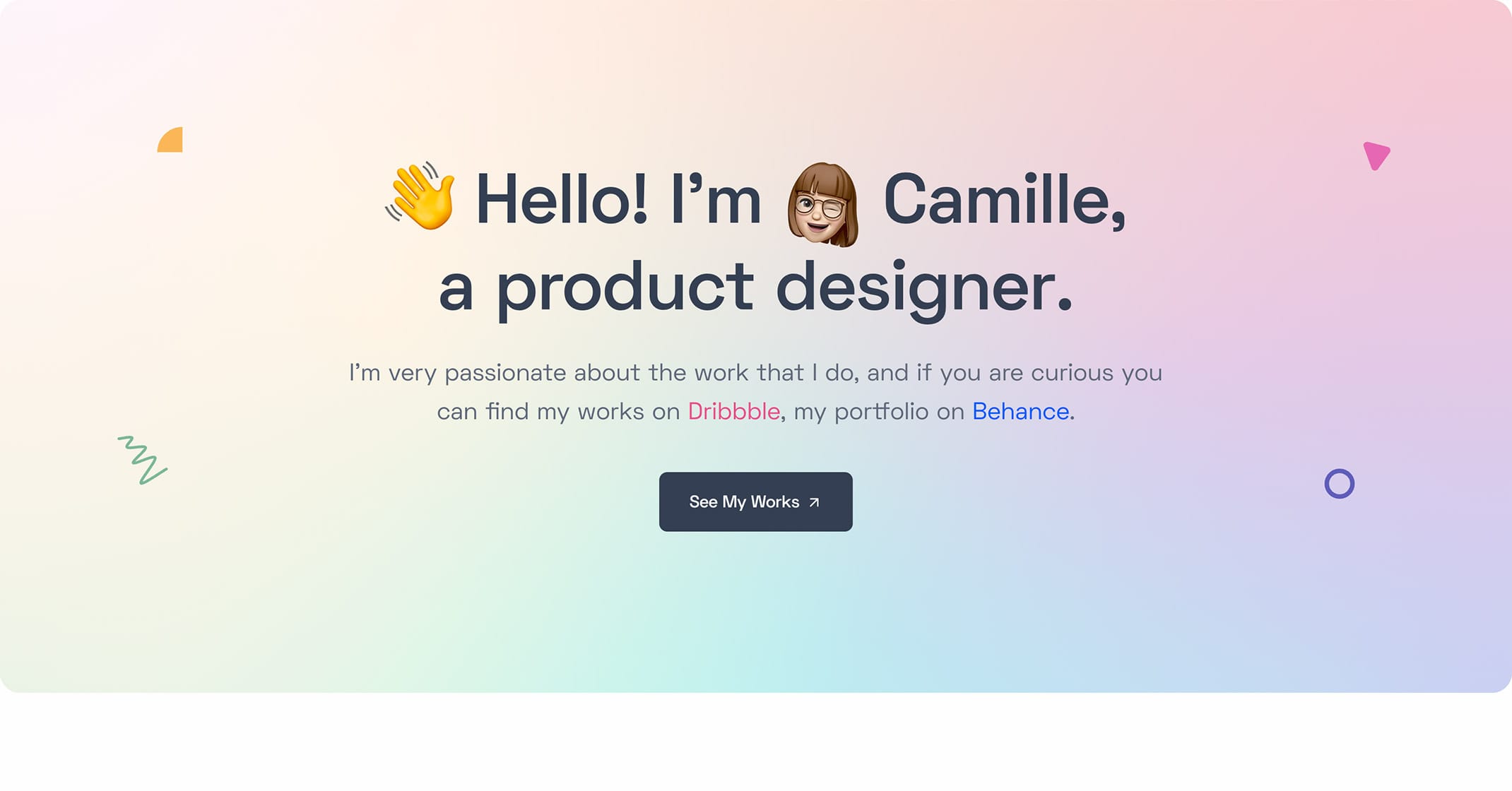 <h1 class="display-1 fs-70 px-md-10 px-lg-0 px-xl-8 mb-5">👋 Hello! I'm <img class="d-inline w-12 mx-1" src="./assets/img/avatars/avatar.png" alt=""> Camille, a product designer.</h1>